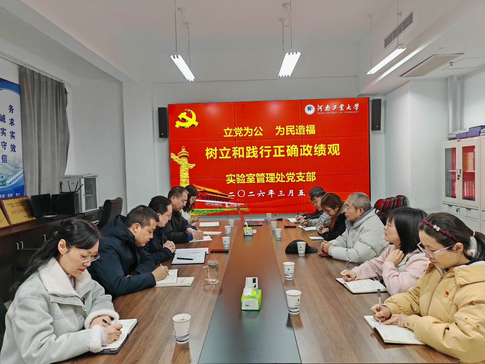 全体党员结合实验室管理处工作实际开展交流。一致认为,实验室管理工作作为学校教学科研、学科建设的重要保障,树立正确政绩观就是要坚持实事求是、真抓实干,把“师生满意、科研所需、教学所急”作为工作出发点和落脚点,立足岗位职责,以科学决策提升实验室管理效能,以务实举措破解实验室建设、设备管理、安全保障等方面的难点问题,以过硬作风筑牢实验室安全防线,创造经得起实践、师生和历史检验的工作实绩。
