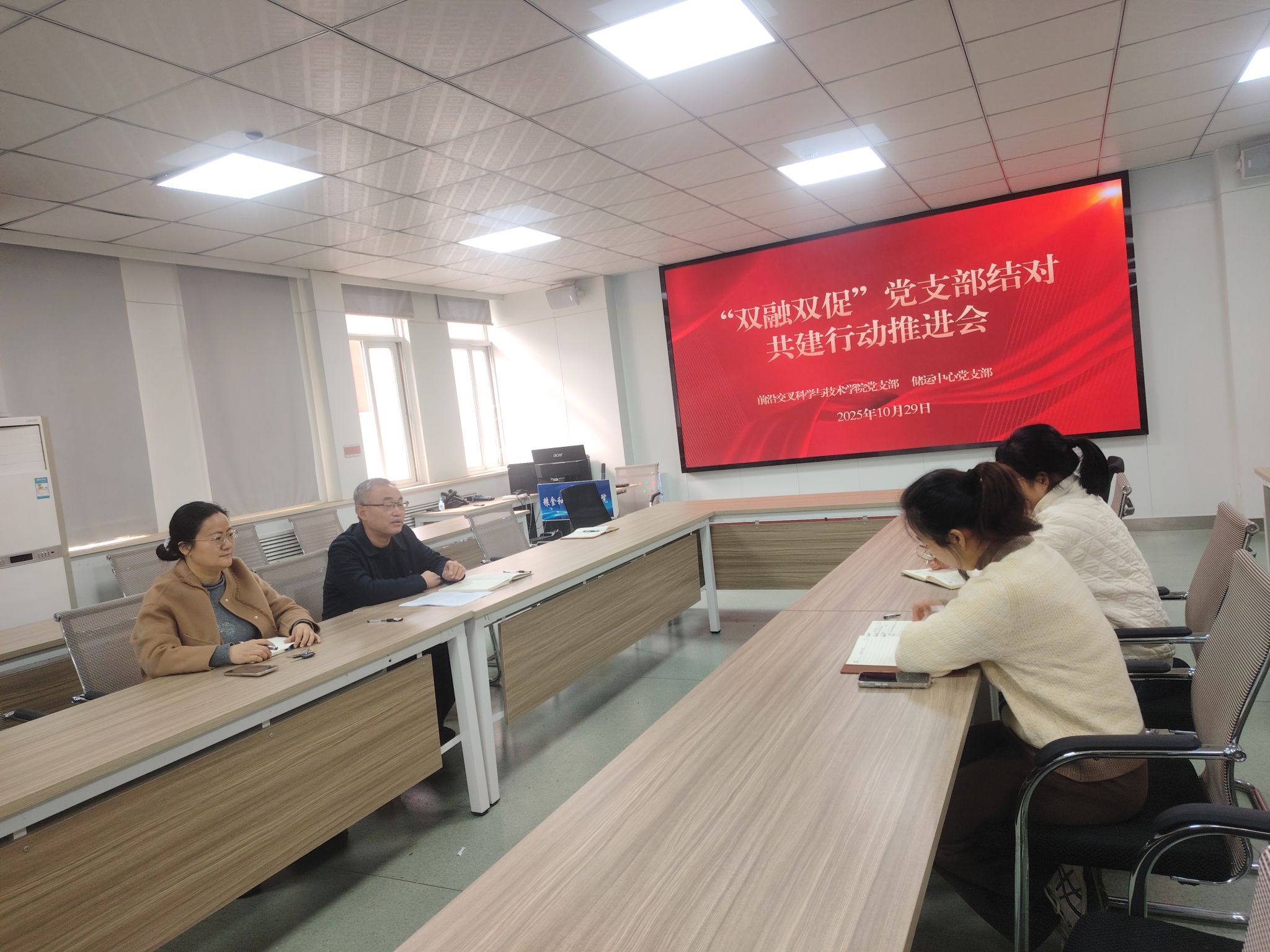 为贯彻落实校党委《关于开展“双融双促”机关党支部与学院党支部结对共建行动的通知》要求,10月29日,前沿交叉科学与技术学院党支部赴粮食和物资储备学院与储运中心党支部开展结对共建工作座谈会。机关党委副书记、纪委书记薛运侠、前沿交叉科学与技术学院党支部书记张浩、组织委员李金玲、粮食和物资储备学院储运中心党支部书记马雪、宣传委员王艳艳参加会议。座谈会由前沿交叉科学与技术学院党支部书记张浩主持。
