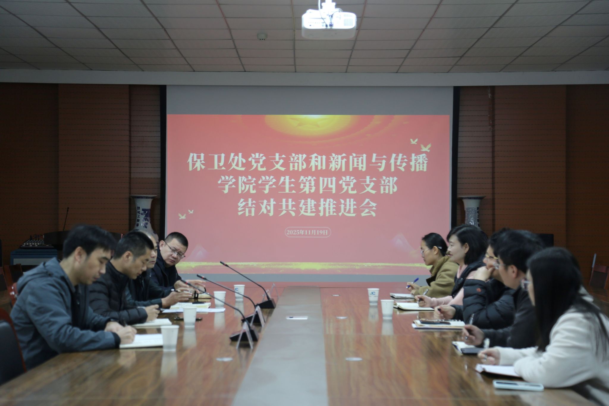 为总结党支部结对共建前期工作、明确深化路径,近日,保卫处党支部与新闻与传播学院学生第四党支部结对共建推进会在博闻楼5203会议室举行。机关党委书记梁朗,保卫处处长、保卫处党支部书记孙明亮,保卫处副处长李磊,新闻与传播学院书记杨子江,党委副书记、学生第四党支部书记张小鸥及相关同志参加会议。