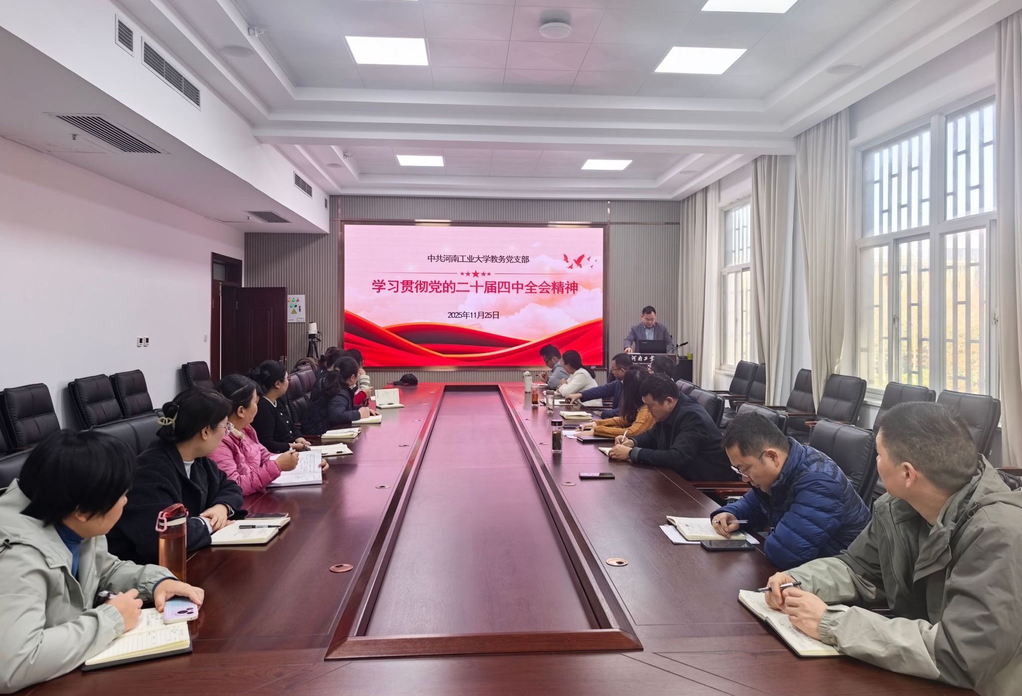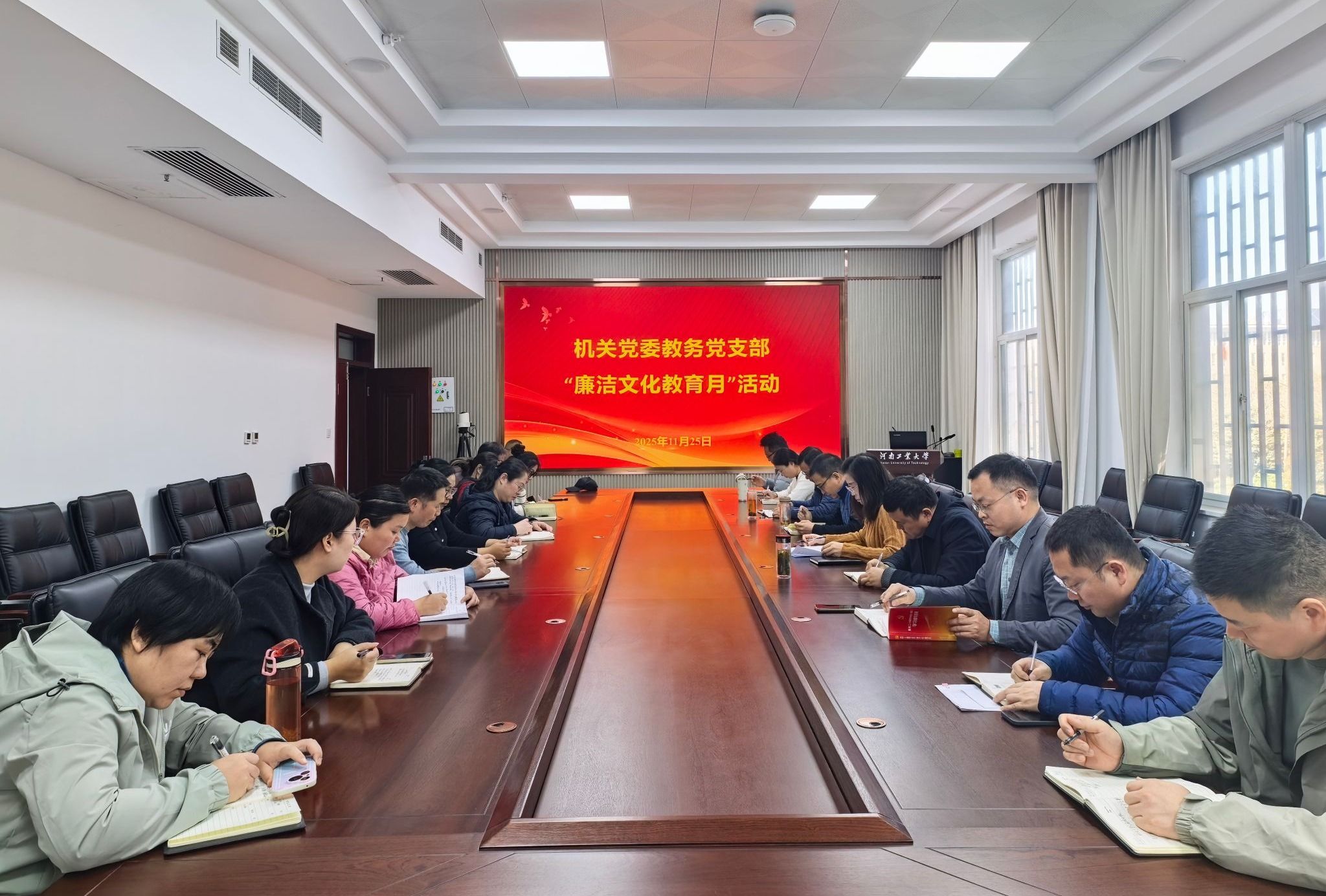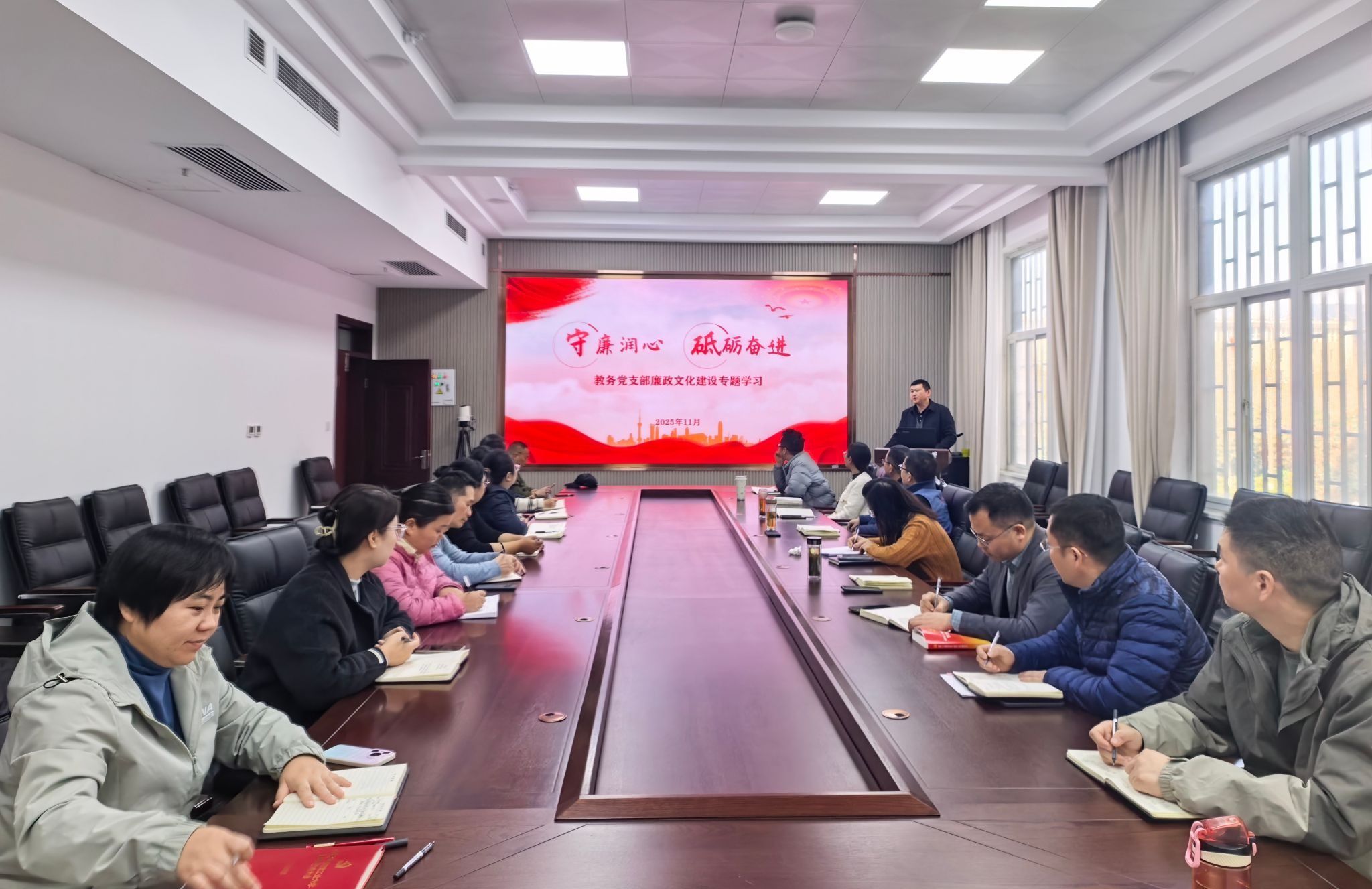 为深入学习贯彻党的二十届四中全会精神,全面落实新时代全面从严治党战略部署,持续深化党风廉政建设,夯实党员干部廉洁自律思想根基,11月25日,教务党支部在行政楼B201会议室精心组织开展党的二十届四中全会精神宣讲会暨廉洁文化教育月活动,活动由支部副书记兼宣传委员赵静主持,教务处、三中心全体教职工参加。
