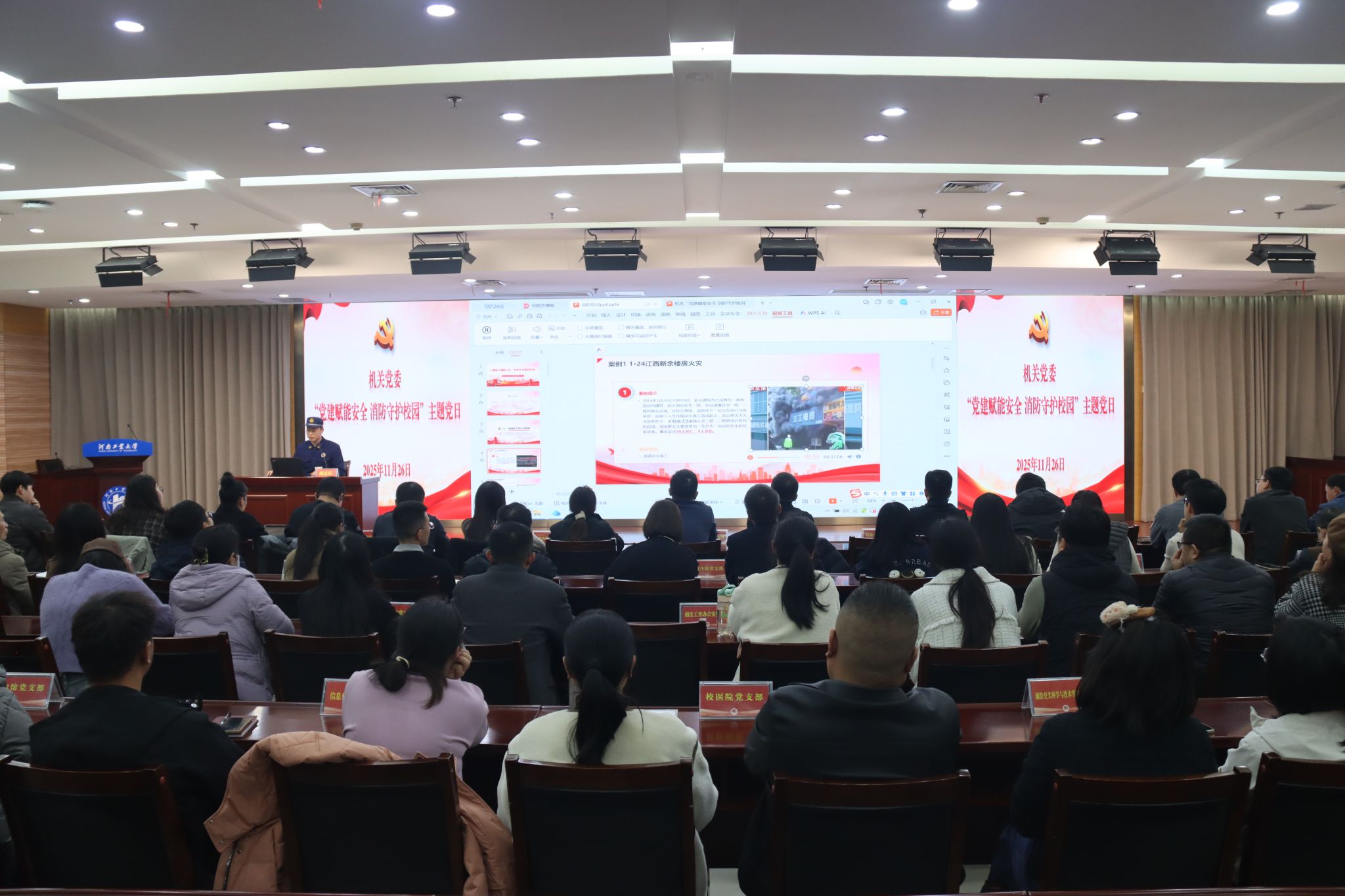 为深入贯彻落实《河南工业大学2025年119消防月活动方案》,以党建引领筑牢校园消防安全防线,切实提升机关教职工消防安全意识和应急处置能力,11月26日机关党委在行政楼D205报告厅举办“党建赋能安全 消防守护校园”主题党日。活动由机关党委副书记薛运侠主持,特别邀请郑州市消防支队高新区大队宣传员杨孟臣同志现场授课指导。保卫处副处长李芳炎、机关各处室消防安全联络人、各党支部党员代表及保卫处消防科工作人员参加活动。