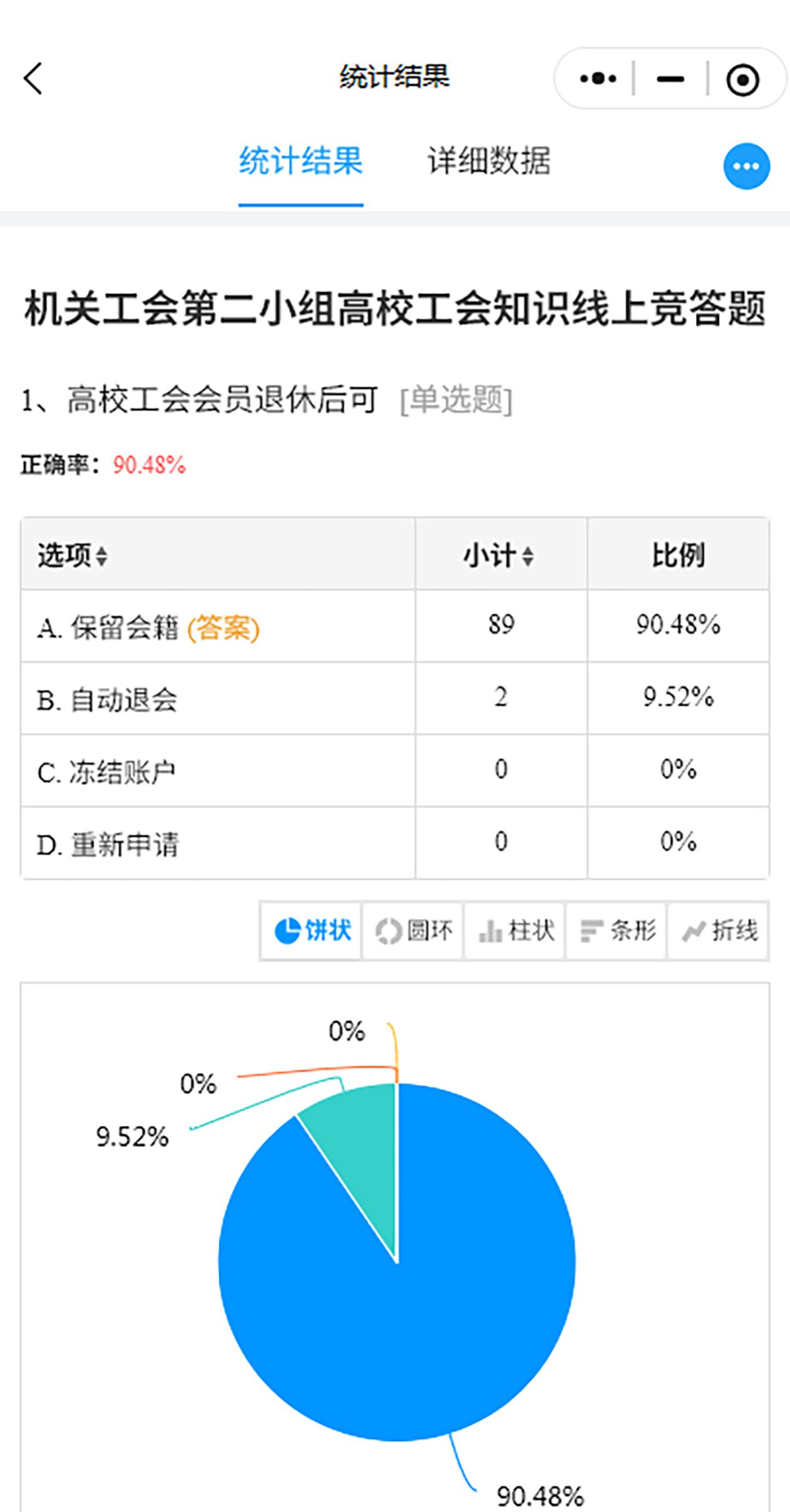 为庆祝河南省总工会成立100周年,深入推动高校工会政策入脑入心,机关工会第二小组于10月21日至25日组织开展了为期5天的“高校工会知识线上竞答”活动。全体会员积极参与,通过手机端小程序进行答题,活动取得了良好效果。